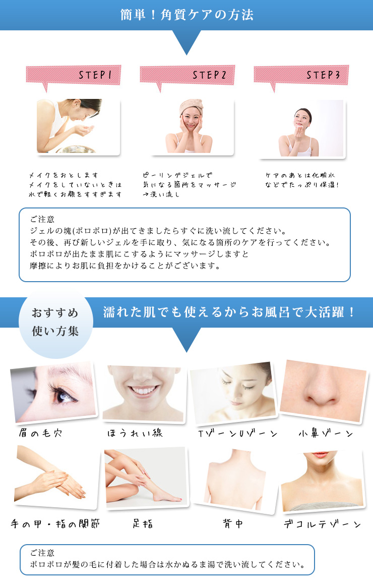 - 本品は洗い流し用ジェルです。ご使用後は水又はぬるま湯で洗い流してください。